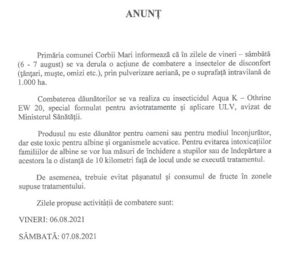 Acțiune de dezinsecție aeriană în comuna Corbii Mari, astfel Primăria comunei Corbii Mari informează că, în perioada 06 – 10 august, se va derula o acțiune de combatere a insectelor de disconfort (ţânţari, muşte, omizi, gândaci etc.), prin pulverizare aeriană, pe o suprafață intravilană de 1.000 ha.