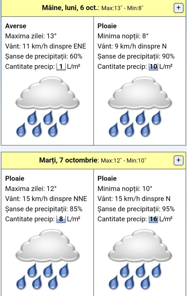 Luni (06 oct.): Ploaie și burniță ocazională, temperatură maximă ~ 14 °C, minimă ~ 9 °C.
