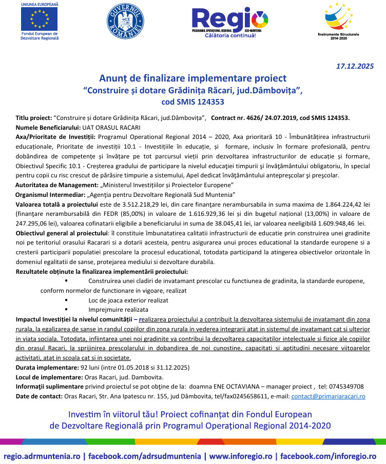 Anunț de finalizare implementare proiect “Construire și dotare Grădinița Răcari, jud.Dâmbovița”,cod SMIS 124353