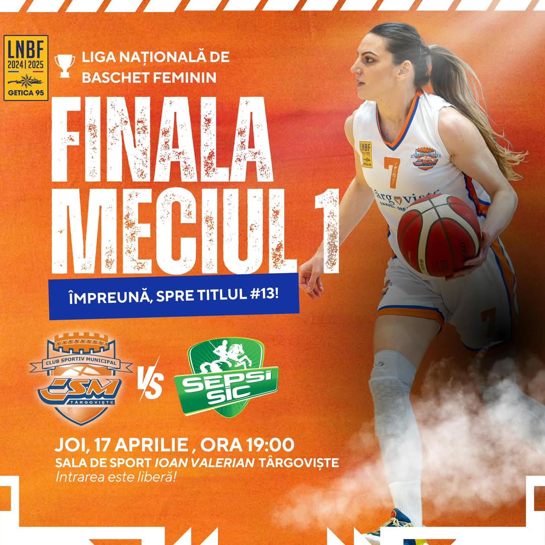 CSM Târgoviște joacă primul meci din finala Ligii Naționale de Baschet Feminin. Sala Sporturilor „Ioan Valerian” din Târgoviște va fi, în această seară, scena primului meci din finala Ligii Naționale de Baschet Feminin. De la ora 19:00, CSM Târgoviște întâlnește o adversară redutabilă într-o confruntare care marchează începutul luptei pentru titlul național.