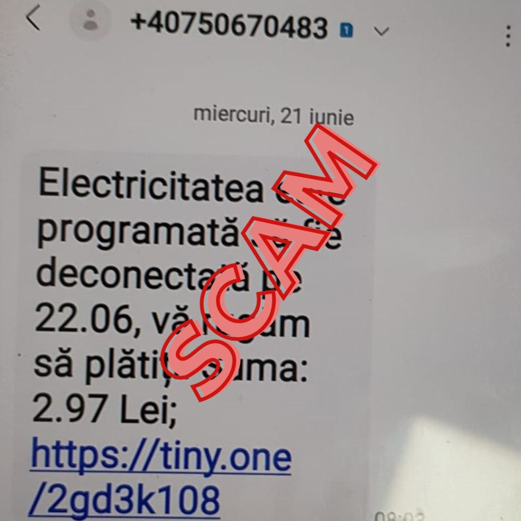 ATENȚIE!Continuă campania frauduloasă propagată prin SMS, care vizează utilizatori din România cu un mesaj bazat pe scenariul clasic al neplății facturii pentru consumul de energie electrică și amenințarea cu sistarea furnizării serviciului. Astfel ei generează emoție și neatenție în rândul potențialelor victime.