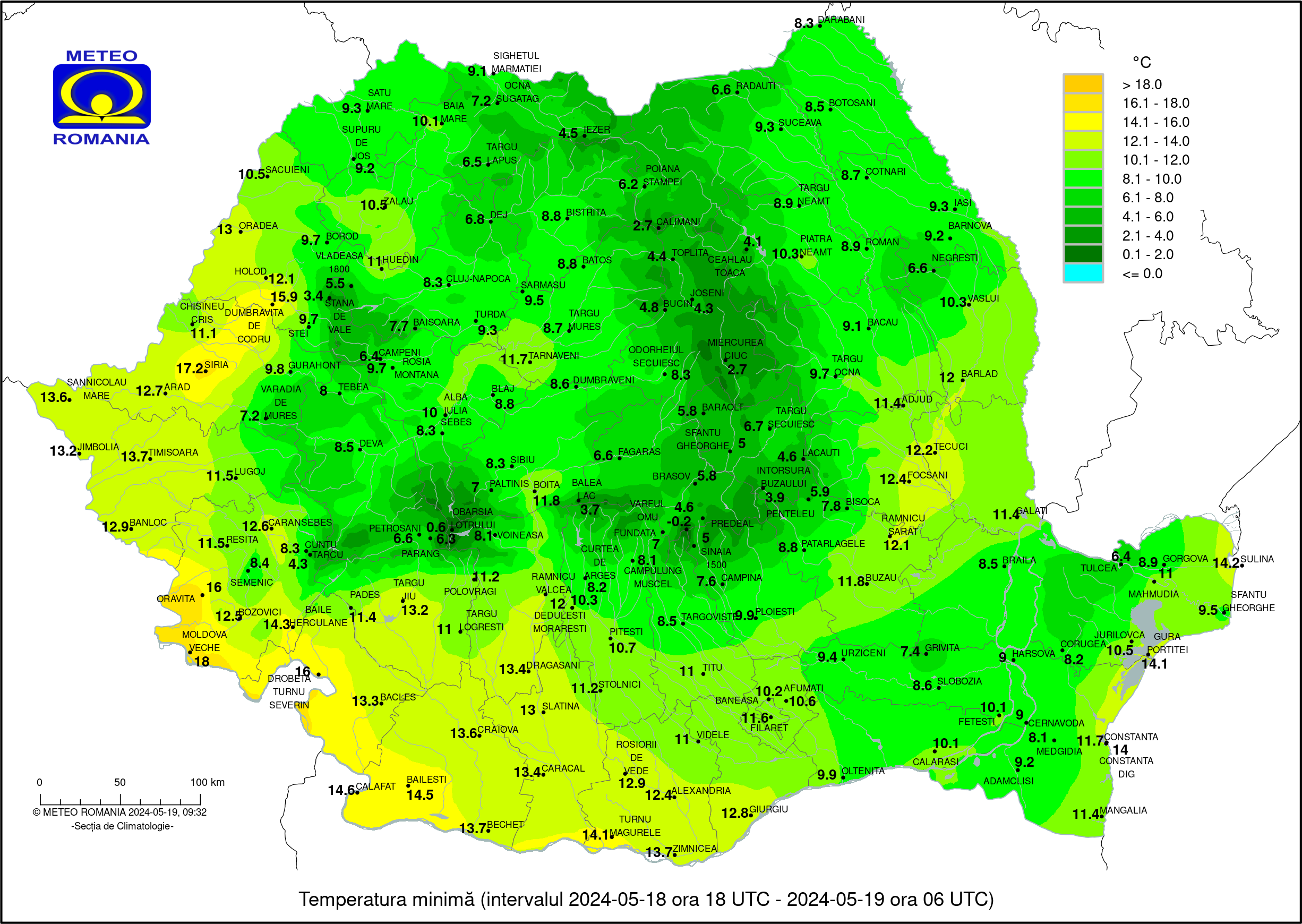 Temperaturile maxime se vor încadra între 21 şi 24 de grade, mai scãzute pe litoral; minimele termice vor fi cuprinse între 8 şi 15 grade.