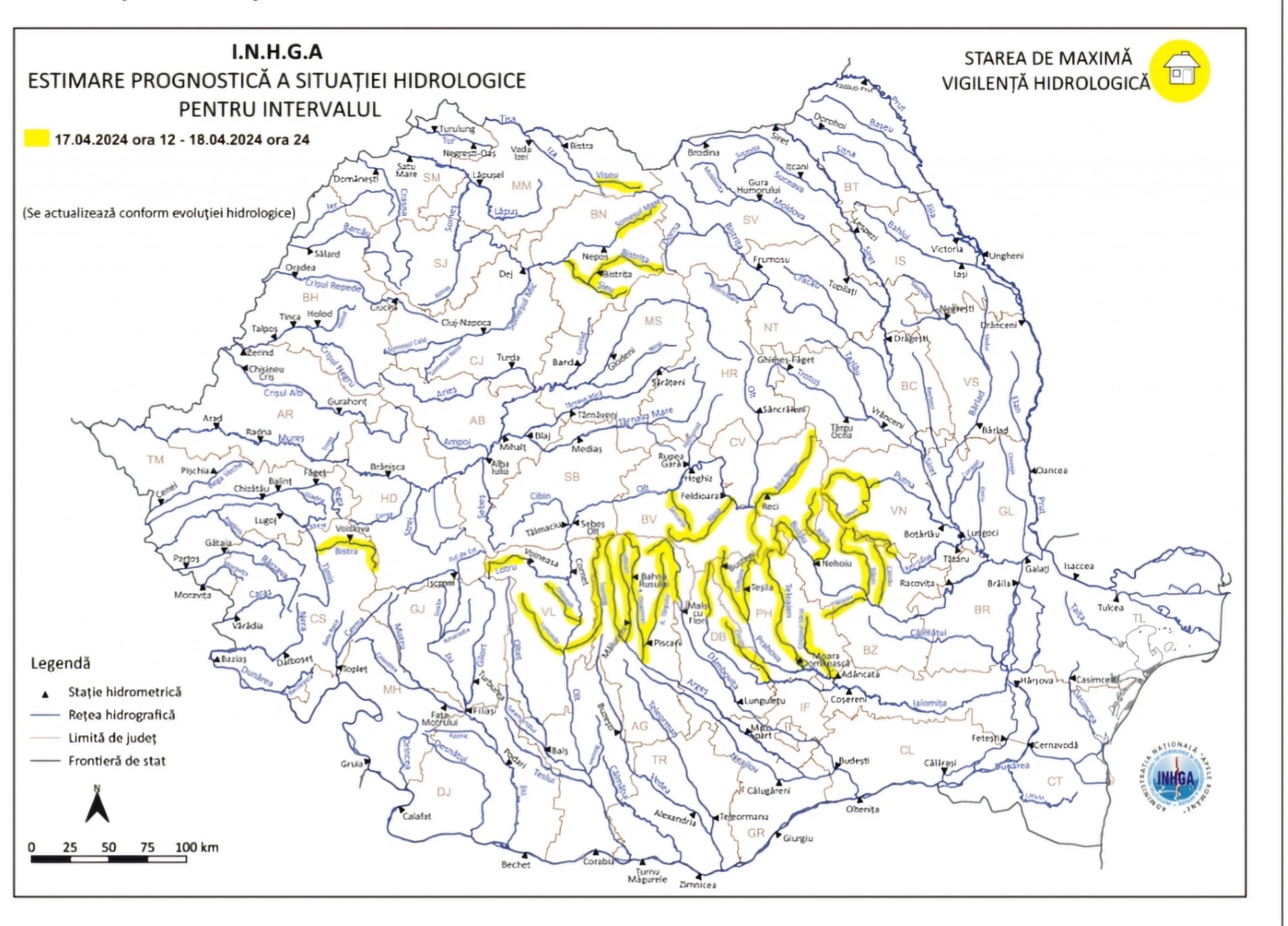 ATENȚIONARE HIDROLOGICĂ COD GALBEN de INUNDAȚII în județul Dâmbovița, interval de valabilitate: 17 aprilie, ora 12:00 – 18 aprilie, ora 09:00