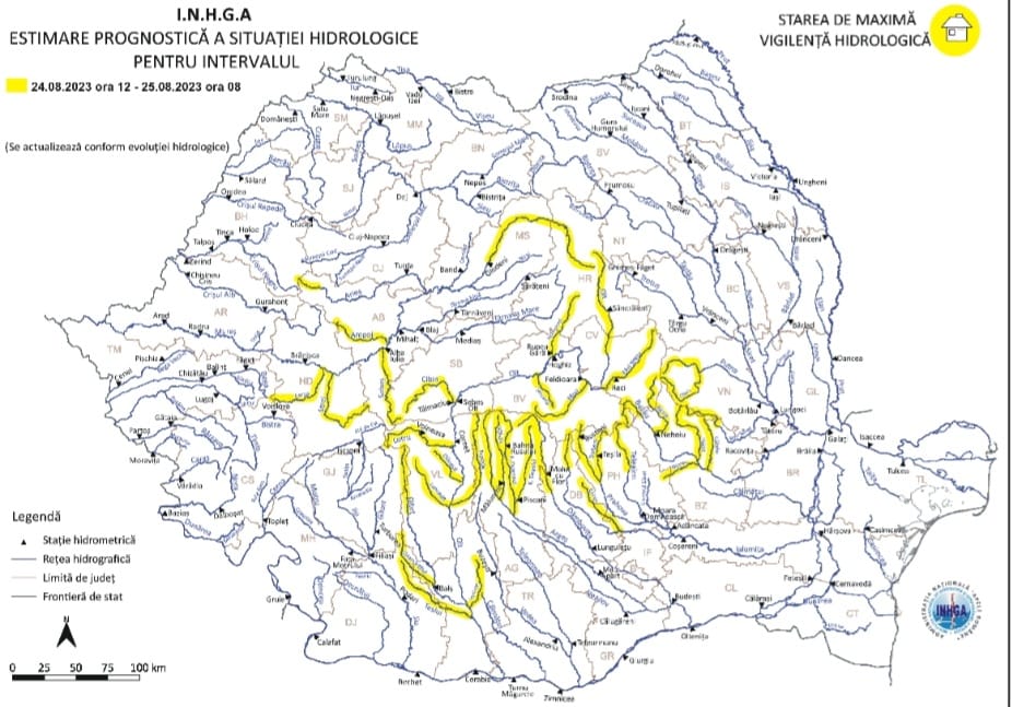 Atenționare hidrologică COD GALBEN valabilă în perioada 24 august ora 12:00 – 25 august ora 08:00 pentru râurile: Argeș – bazin superior, Dâmbovița – bazin superior și Ialomița – bazin aval SH Moroeni și afluenții aferenți sectorului aval SH Moroeni – amonte SH Siliștea Snagovului.