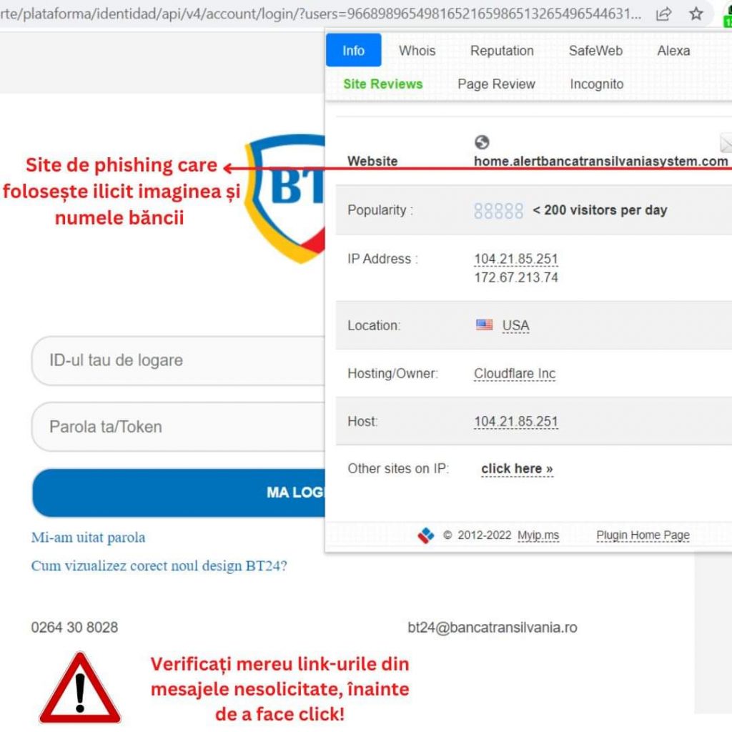 Nu uita că te poți antrena să identifici la timp identifica tenativele de fraudă de pe internet pe site-ul https://sigurantaonline.ro. Siguranta Online este o campanie de conștientizare la nivel național, derulată de DNSC, Poliția Română și Asociația Română a Băncilor, alături de parteneri din zona privată .