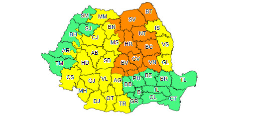 În estul și sud-estul Transilvaniei, cea mai mare parte a Moldovei, în zona Carpaților Orientali și estul Carpaților Meridionali vor fi averse torențiale, descărcări electrice, intensificări de scurtă durată ale vântului și pe arii restrânse vijelii și grindină. În intervale scurte de timp sau prin acumulare cantitățile de apă vor fi de 30…40 l/mp și izolat de peste 50 l/mp.