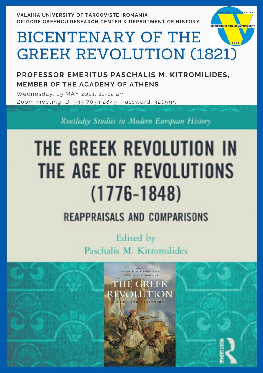 Universitatea „Valahia” din Târgoviște va găzdui miercuri, 19 mai 2021, începând cu ora 11:00, seminarul cu titlul „Bicentenarul Revoluției Grecești de la 1821”, susținut de Profesorul emerit Paschalis M. Kitromilides de la Universitatea din Atena, membru din anul 2020 al prestigioasei Academii de la Atena.