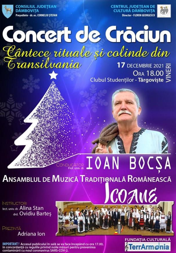 Consiliul Județean Dâmbovița, prin Centrul Județean de Cultură, vă invită vineri, 17 decembrie 2021, începând cu ora 18:00, la Clubul Studenților, la un eveniment special desfășurat în preajma Sărbătorilor de iarnă: „Cântece rituale și colinde din Transilvania”.