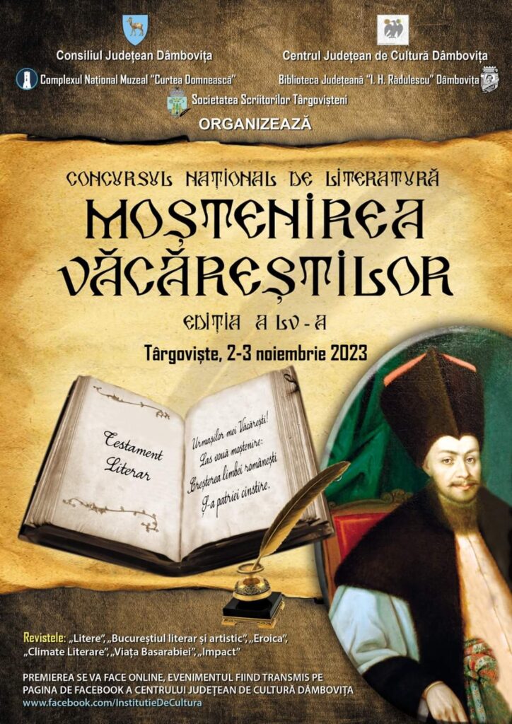Cea de-a LV – a ediţie a Concursului Naţional de Literatură „Moştenirea Văcăreştilor”,eveniment organizat de Consiliul Judeţean Dâmboviţa, prin Centrul Judeţean de Cultură Dâmboviţa, împreună cu Societatea Scriitorilor Târgovişteni, Biblioteca Judeţeană „I. H. Rădulescu”, Complexul Național Muzeal „Curtea Domnească” şi cu sprijinul Uniunii Scriitorilor din România, în perioada 2-3 noiembrie 2023.