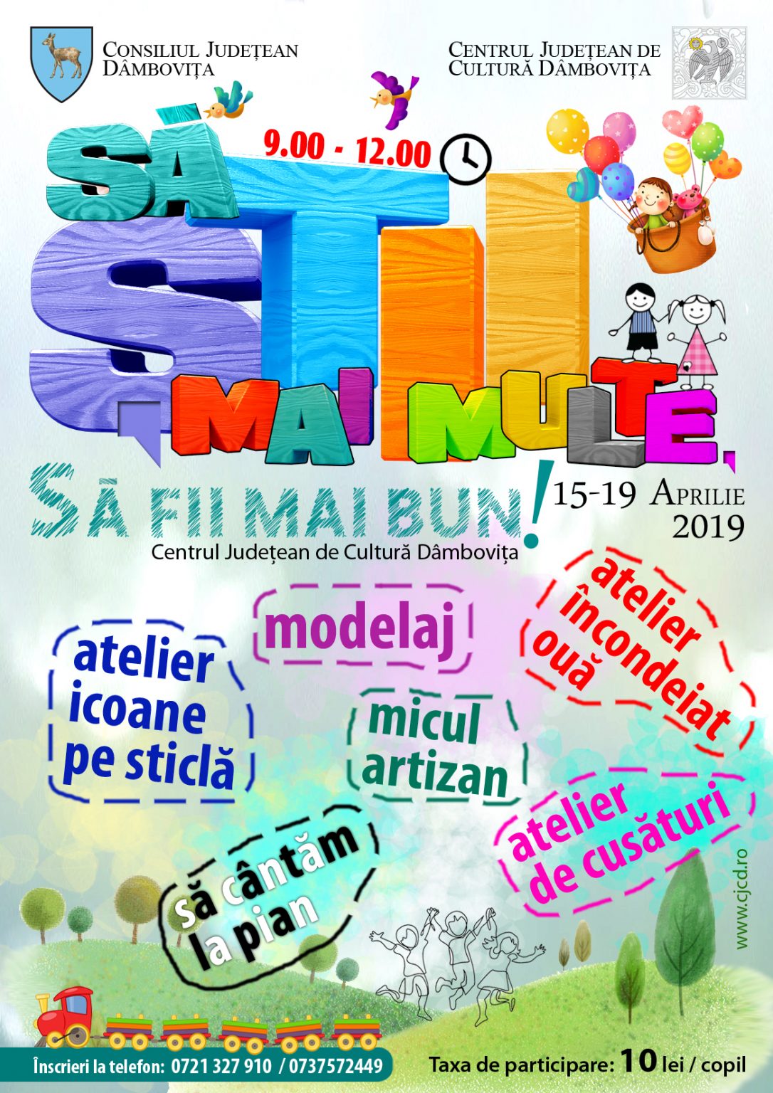Centrul Judeţean de Cultură Dâmboviţa va desfășura, în săptămâna 15-19 aprilie 2019, programul cultural educaţional „Să știi mai multe, să fii mai bun!”, o săptămână dedicată activităţilor extracurriculare, program ce a ajuns anul acesta la cea de-a VII-a ediție.