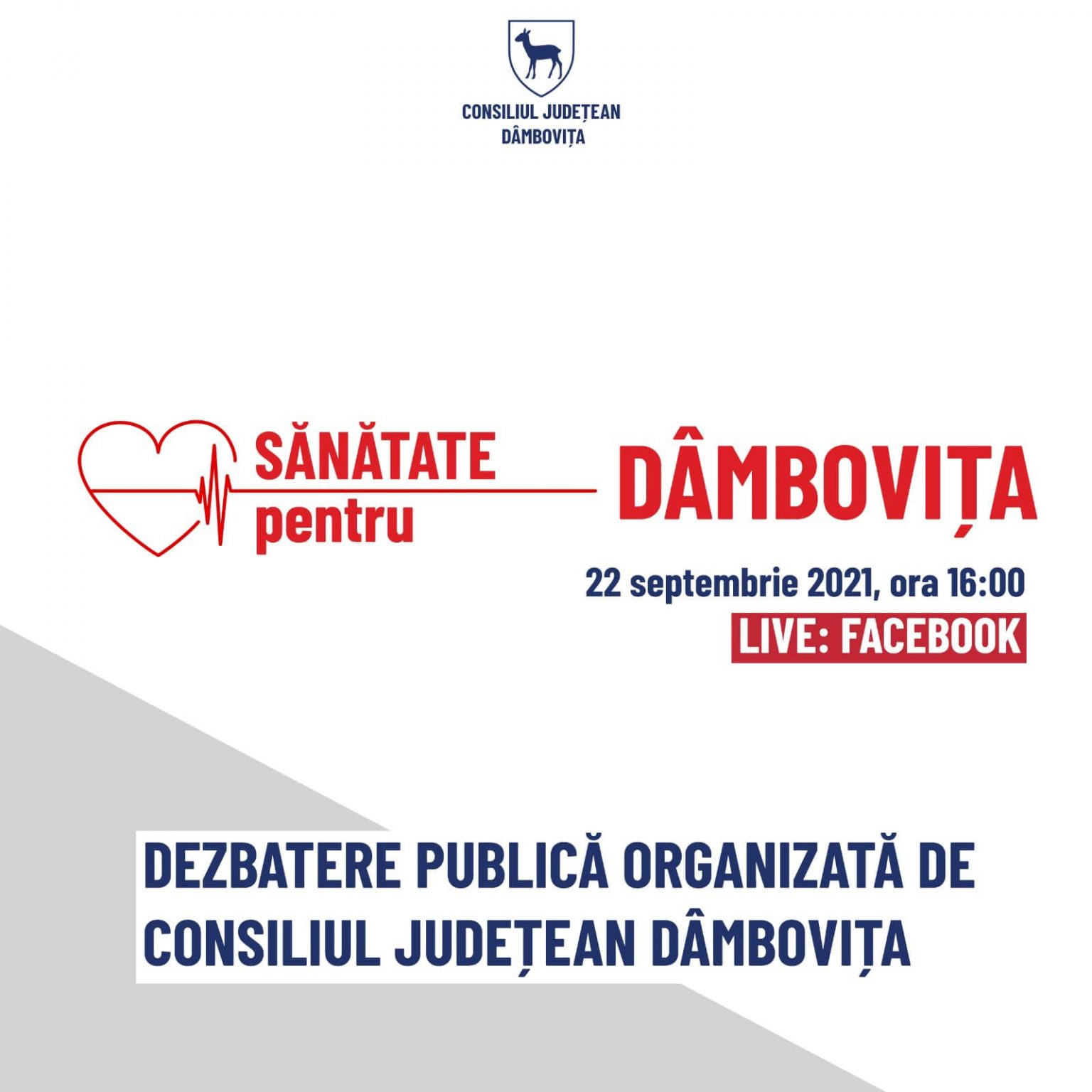 Miercuri, 22 septembrie 2021, dezbaterea publică „Sănătate pentru Dâmbovița”, va avea loc la Centrul Internațional de Conferințe al Universității Valahia din Târgoviște (Str. Maior Ion Alexandrescu nr. 39), începând cu ora 16:00. Agenda evenimentului se va concentra pe teme esențiale referitoare la sistemul de sănătate din țara noastră.  Dezbaterea se va desfășura atât  cu prezență fizică cât și online.
