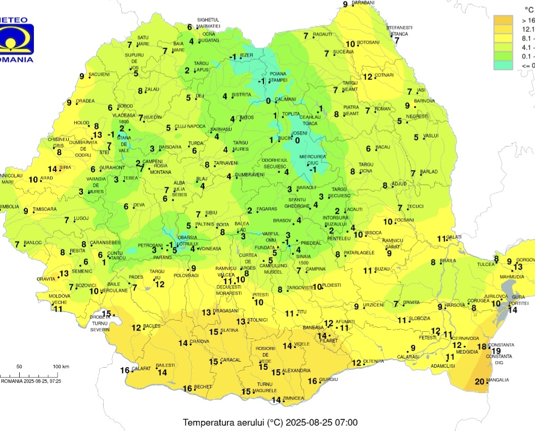 România trece printr-un contrast termic extrem la final de vară. În dimineața zilei de 25 august 2025, la ora 07:00, stațiile meteo din zonele montane au înregistrat -1°C, în timp ce, cu doar câteva zile înainte, termometrele urcau la peste 30°C în aproape toată țara.