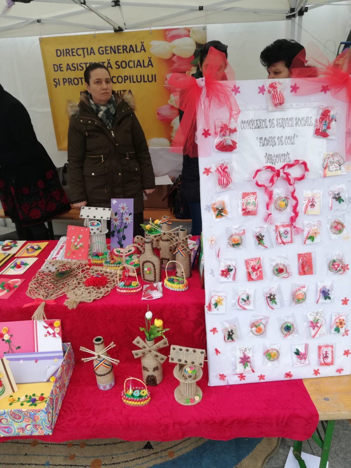 Obiectele mici, viu colorate, realizate din hârtie, mărgele, picturi, dar și croșetate cu multă atenție, sunt expuse spre vânzare la Târgul de cadouri și mărțișoare din Piața Mihai Viteazul Târgoviște. Beneficiarii, de toate vârstele, au lucrat de zor la mărțișoare și felicitări, ajutați fiind de personalul din centre.