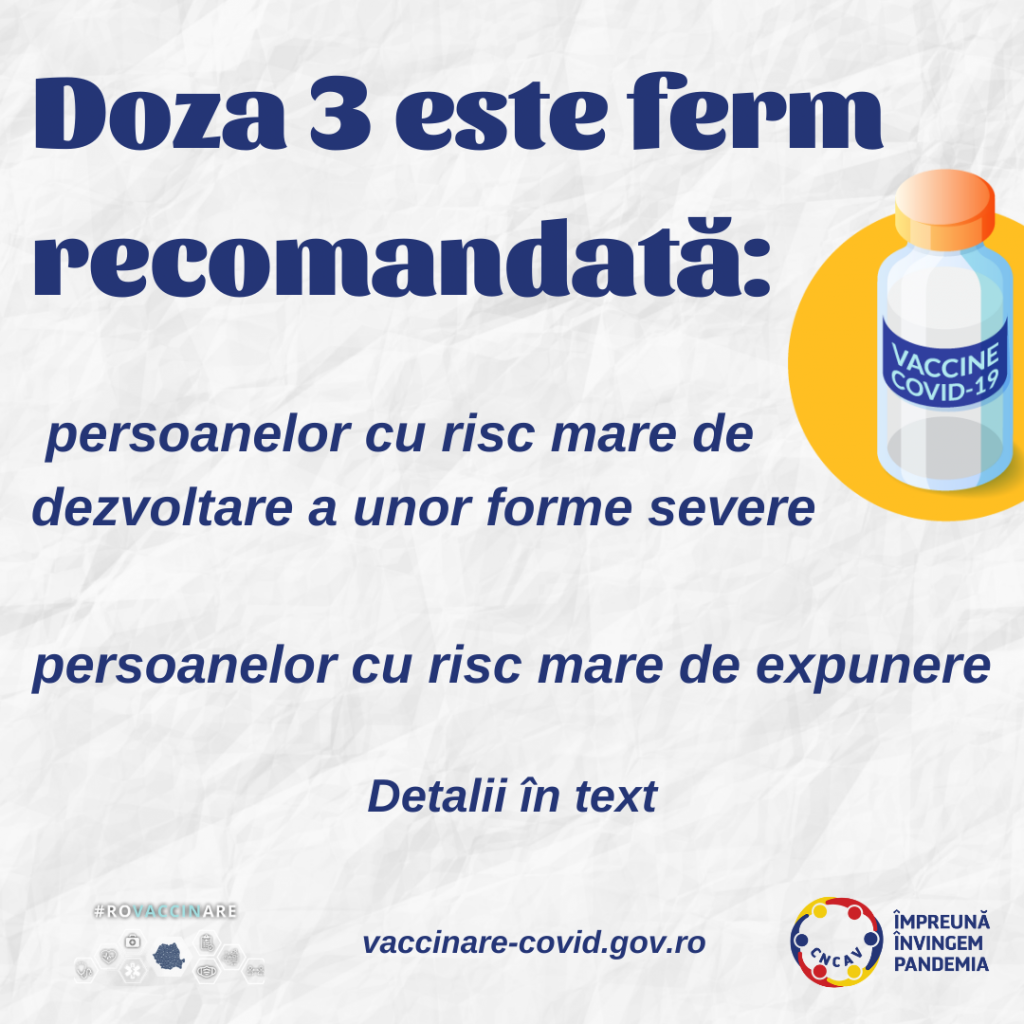 A treia doză se va face doar cu vaccin cu ARN Mesager (Pfizer sau Moderna), indiferent cu ce vaccin s-au făcut primele două doze. Doza 3 poate fi administrată oricărei persoane care are cel puțin 6 luni de la doza 2, însă este recomandată în primul rând persoanelor vulnerabile – cu vârsta peste 65 de ani sau care suferă de boli cronice – și persoanelor cu risc mare de expunere – personal medico-social și din învățământ.