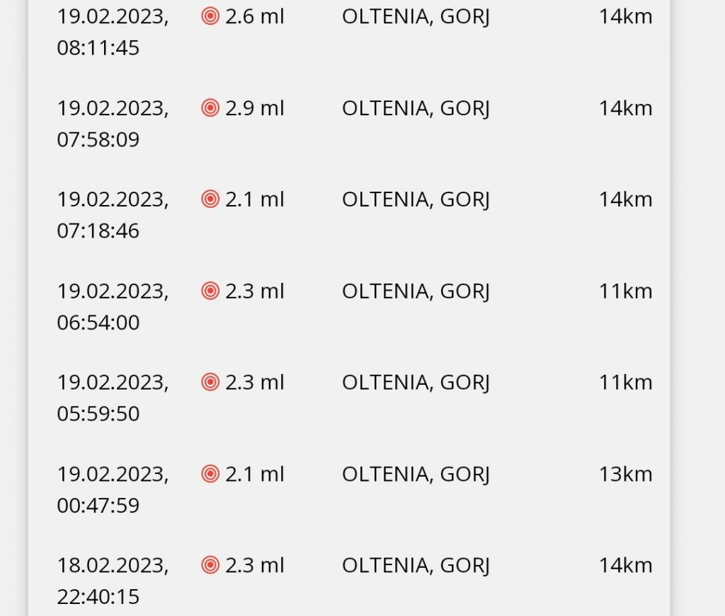 În ziua de 19 Februarie 2023 la ora 05:59:50 (ora locală a României) s-a produs în OLTENIA, GORJ un cutremur slab cu magnitudinea ml 2.3, la adâncimea de 11km.