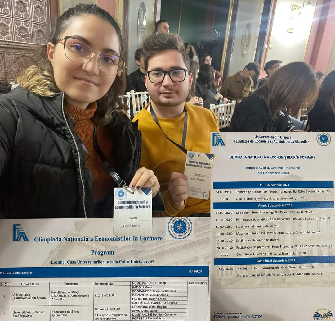 Facultatea de Științe Economice Târgoviște, un grup de studenți de la Universitatea Valahia din Târgoviște, Facultatea de Științe Economice participă la Olimpiada Națională a Economiștilor în Formare privind susținerea de Planuri de Afaceri. Acest eveniment a oferit studenților o oportunitate unică de a-și demonstra abilitățile de antreprenoriat și de a-și prezenta ideile inovatoare.
