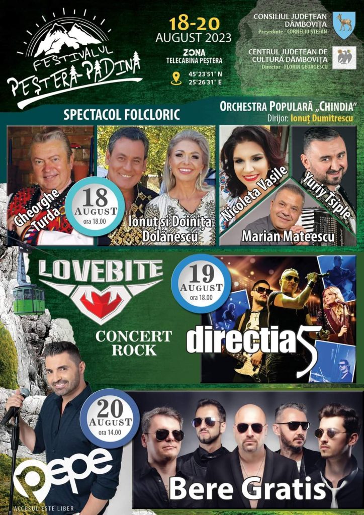 Consiliul Județean Dâmbovița, prin Centrul Județean de Cultură Dâmbovița, va organiza o nouă ediție a Festivalului „Peștera – Padina” în perioada 18 – 20 august 2023. Evenimentul se va desfășura pentru a treia oară în Zona Telecabina Peștera din Munții Bucegi.