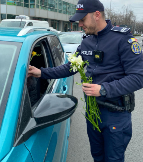 Flori și recomandări adresate doamnelor și domnișoarelor de către polițiști,jandarmi și pompieri, cu prilejul Zilei Internaționale a Femeilor.