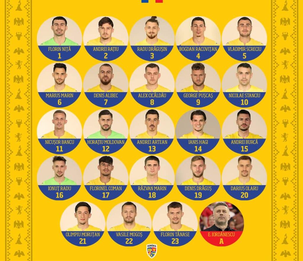 Marius MARIN (Pisa | Italia, 13/0), Vladimir SCRECIU (Universitatea Craiova, 3/0), Andrei ARTEAN (Farul Constanța, 0/0), Răzvan MARIN (Empoli | Italia, 50/3), Alexandru CICÂLDĂU (Konyaspor | Turcia, 33/4), Nicolae STANCIU (Damac | Arabia Saudită, 64/14), Darius OLARU (FCSB, 14/0), Olimpiu MORUȚAN (Ankaragucu | Turcia, 13/1), Marius ȘTEFĂNESCU (Sepsi OSK, 2/0), Ianis HAGI (Deportivo Alaves | Spania, 29/3), Valentin MIHĂILĂ (Parma | Italia, 16/4), Florinel COMAN (FCSB, 10/1);
