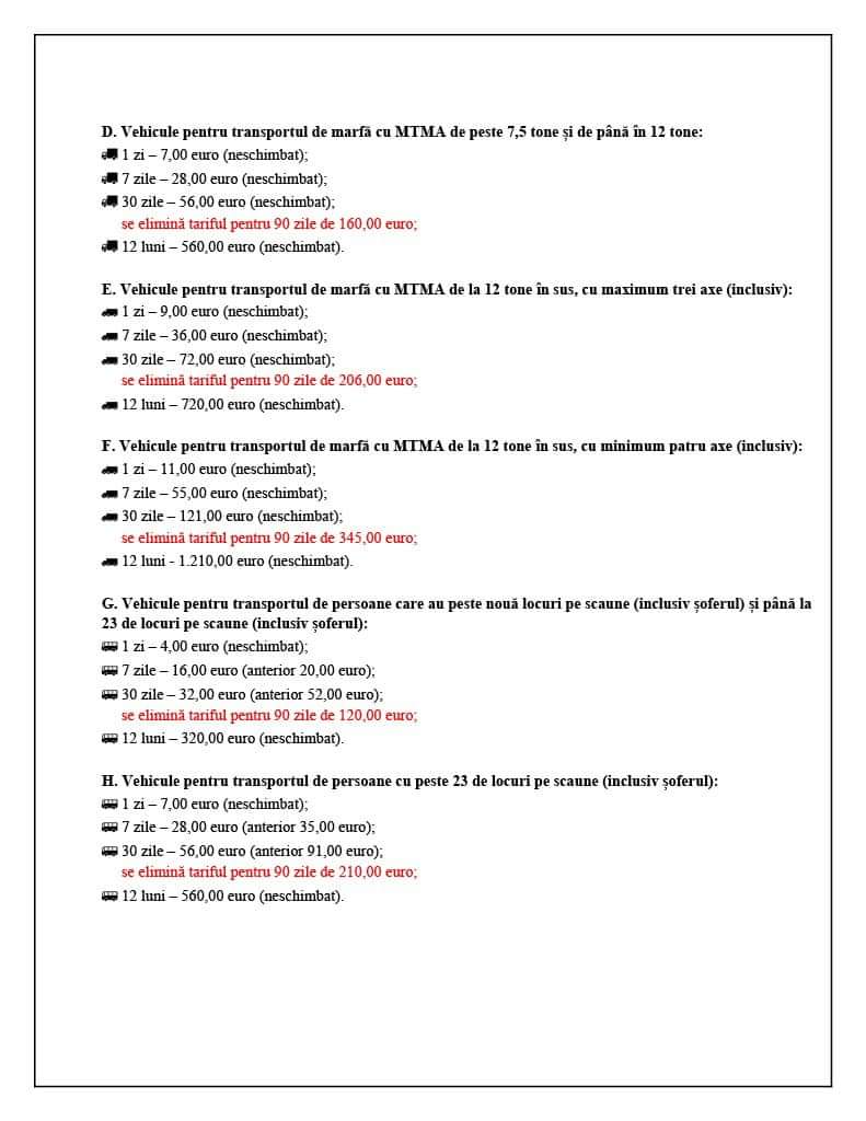 Pentru vehiculele cu tonaj autorizat mai mare de 3,5 t, până la 12 t și pentru cele de transport pasageri cu mai mult de 9 persoane, disponibilitatea tarifelor va fi pentru perioade de o zi, 7 zile, 30 de zile și 12 luni. Pentru aceste vehicule, procentaje maxime pentru tarife, raportate la tariful anual, vor fi de 2% pentru o zi, 5% pentru 7 zile și 10% pentru 30 de zile.