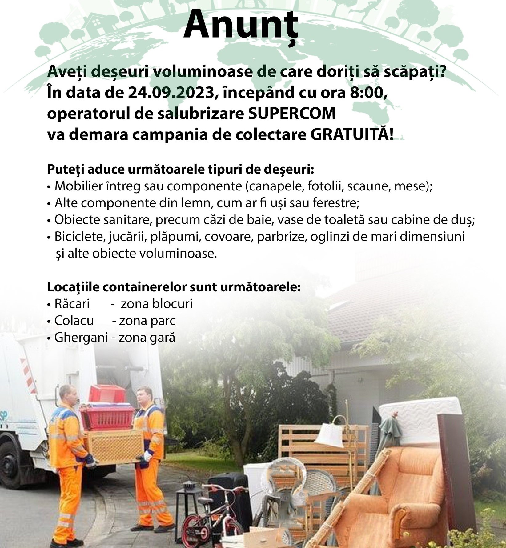 IMPORTANT pentru locuitorii orașului Răcari: Aveți deșeuri voluminoase de care doriți să scăpați? În data de 24.09.2023, începând cu ora 8:00, operatorul de salubrizare SUPERCOM va demara campania de colectare GRATUITĂ!