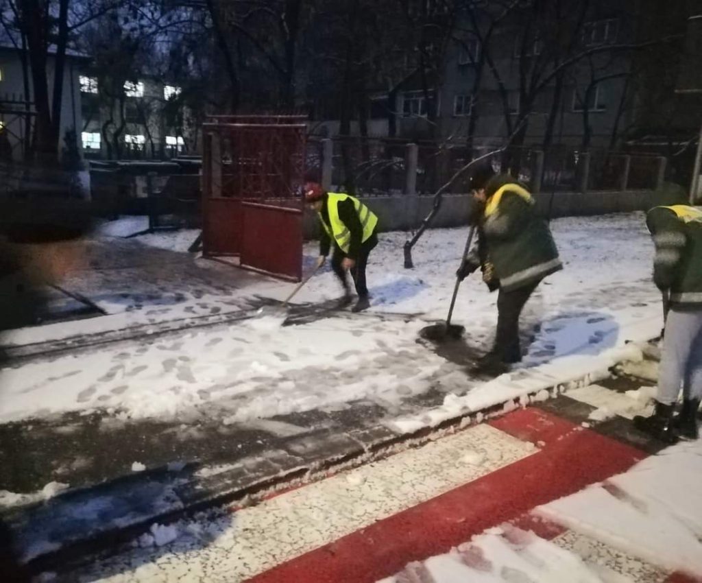 Se curăță trotuarele și se acționează cu material antiderapant pe arterele din tot municipiul.
