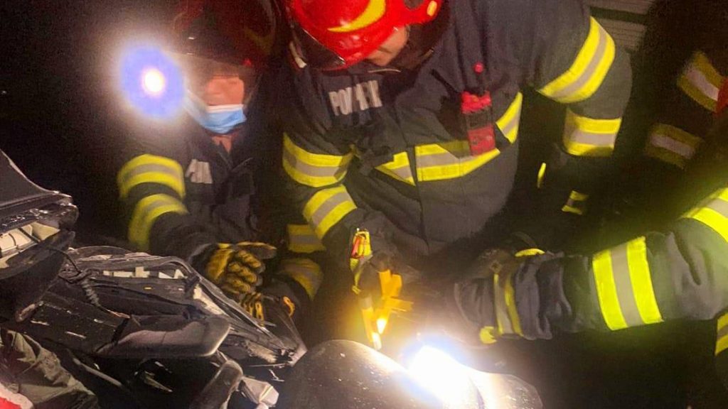 Ajunși la locul accidentului pompierii au început imediat operațiunile de descarcerare a persoanelor rămase blocate în autoturism.