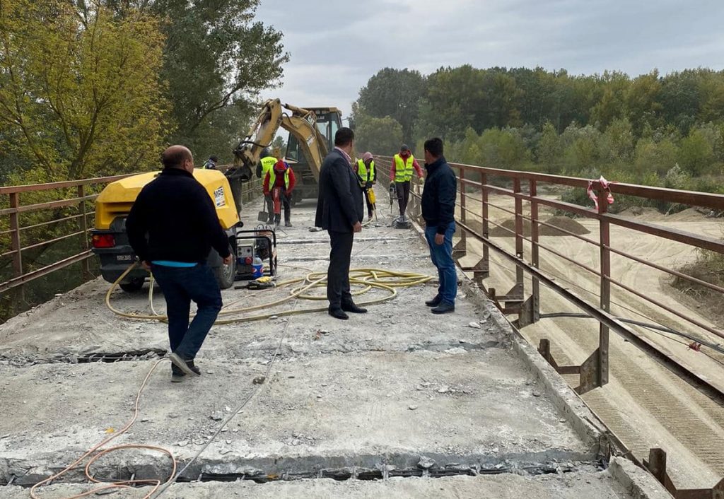 În prezent, se lucrează la dezafectarea căii de rulare și, simultan, se amenajează platforma pentru macaraua ce va servi la realizarea lucrărilor de dezmembrare a plăcilor de beton ale vechiului pod.