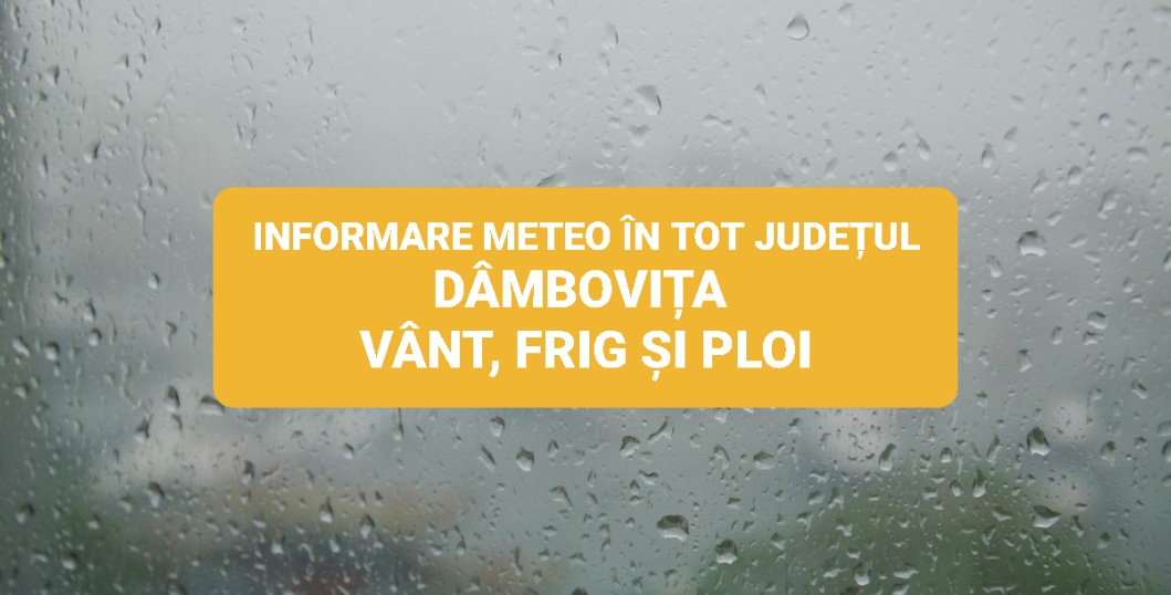 INFORMARE METEOROLOGICĂ de GER, VÂNT PUTERNIC și PLOI pentru tot județul Dâmbovița, interval de valabilitate: 09 noiembrie, ora 12:00 – 11 noiembrie, ora 10:00Fenomene vizate: intensificări ale vântului, precipitații moderate cantitativ, răcire.