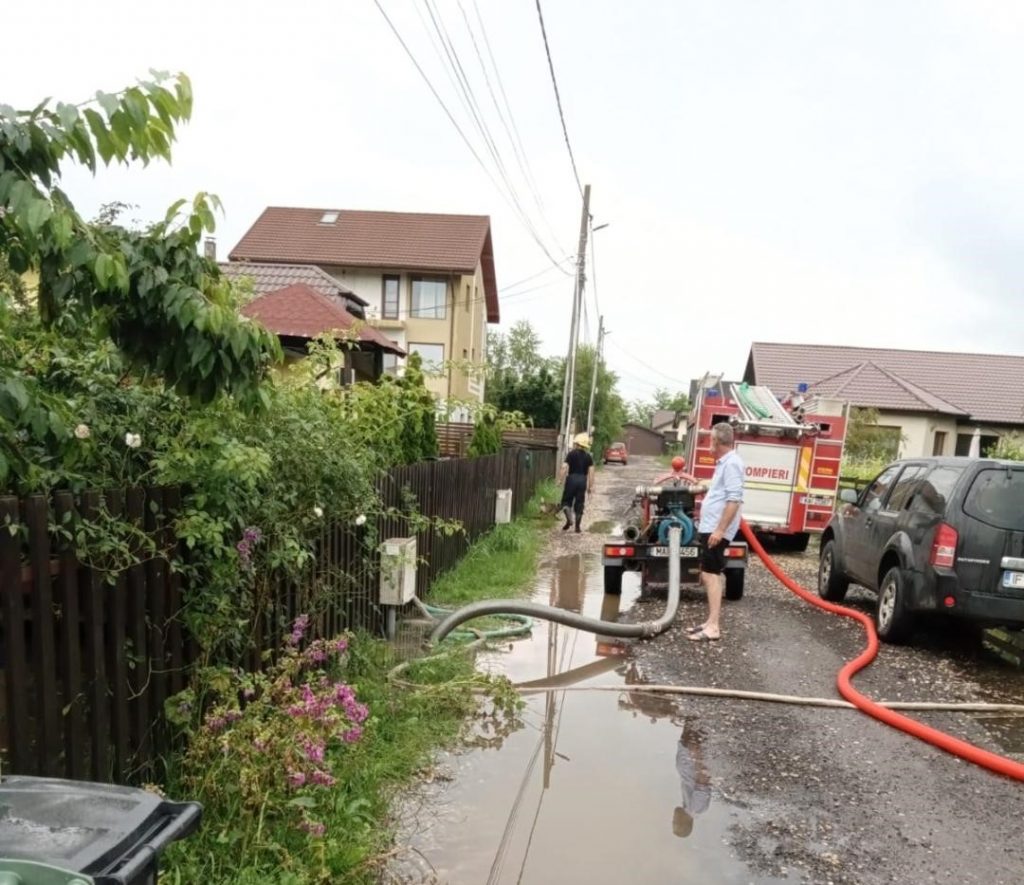Inundații pe DN 7 Tărtășești și în gospodării din Crevedia, din cauza unei reprize de ploi abundente căzute în timp scurt.