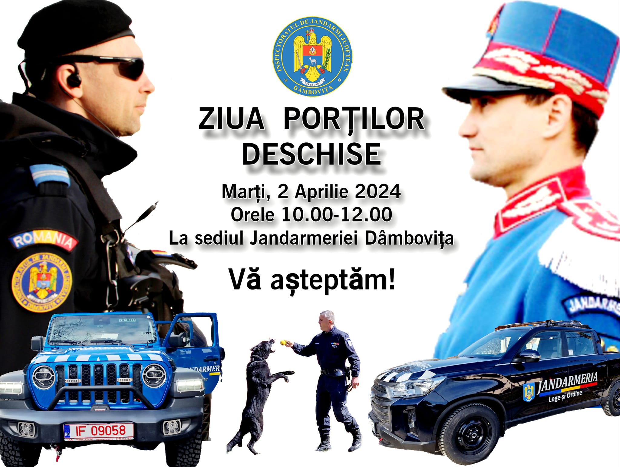 Jandarmeria Dâmbovița îmbracă straie de sărbătoare și are „Ziua Porților Deschise” pentru toți cetățenii, cu mic, cu mare,marți, 2 aprilie, începând cu ora 10:00, la sediul inspectoratului din municipiul Târgoviște, Bulevardul Regele Carol I, nr. 49.