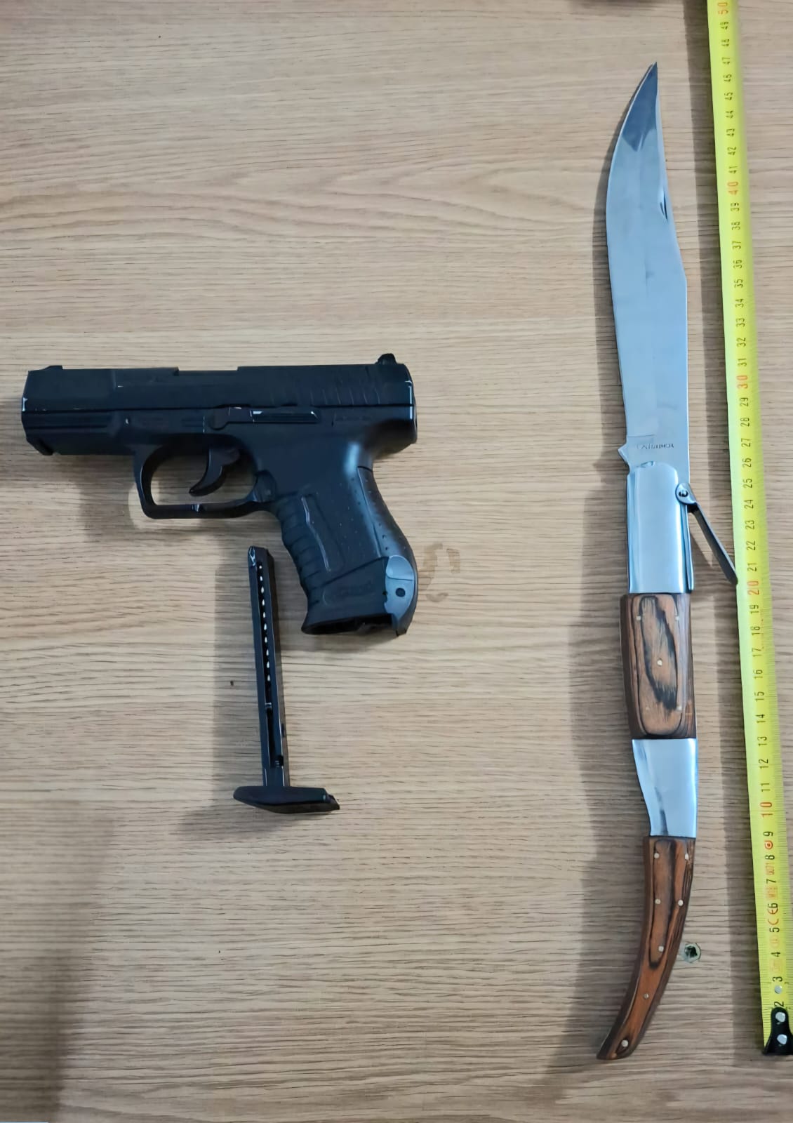 În urma unei acțiuni desfășurate în municipiul Târgoviște, jandarmii au depistat un tânăr de 24 de ani în parcarea unui centru comercial, care deținea un cuțit și un pistol airsoft cu muniție modificată. Persoanei în cauză i s-au întocmit actele de sesizare pentru port ilegal de arme albe și încălcarea regimului armelor și munițiilor.