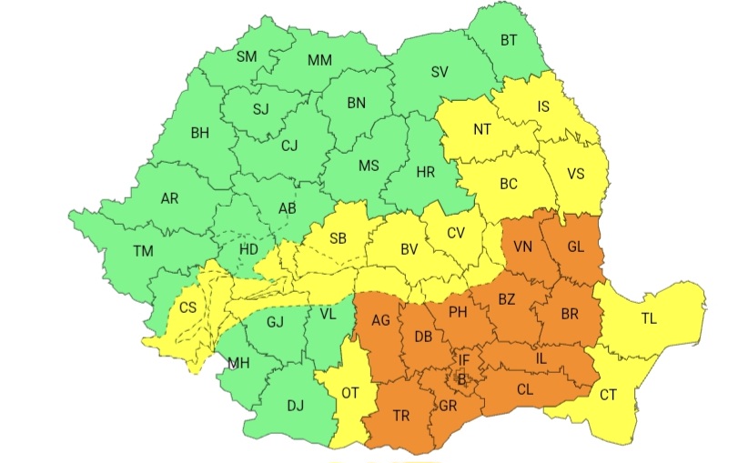 Vânt cu rafale puternice de 60–85 km/h, cu intensități maxime în județele sudice și estice ale Munteniei;