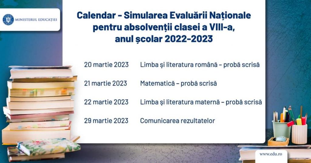 Luni, 20 martie, încep probele simulărilor pentru Evaluarea Națională, accesul elevilor în săli este permis până la ora 8.30. Probele încep la ora 9.00.Timpul destinat elaborării unei lucrări scrise este de 2 ore.
