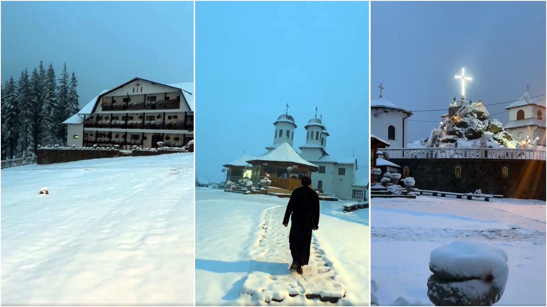 Localnicii și turiștii au fost uimiți de această schimbare neașteptată a vremii. Fotografiile surprinse la mănăstire au captat magia iernii timpurii, cu turnurile și clădirile acoperite de zăpadă strălucitoare.
