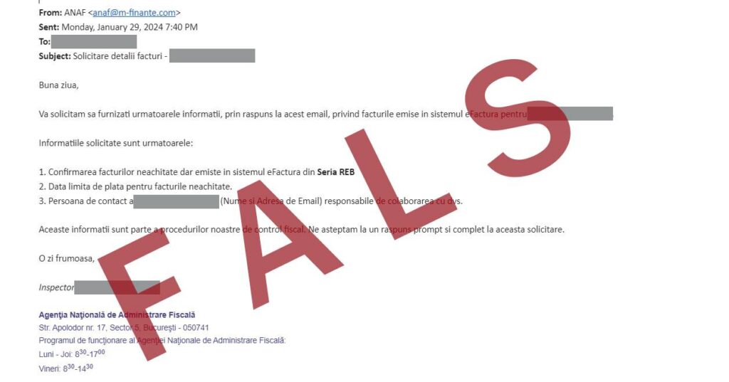 Mesaje false în numele ANAF ,atenționăm asupra unei noi campanii de mesaje false, transmise în numele ANAF, prin care contribuabilii sunt rugați să furnizeze informații privind facturile emise în sistemul e-Factura pentru societățile pe care le administrează sau la care lucrează.