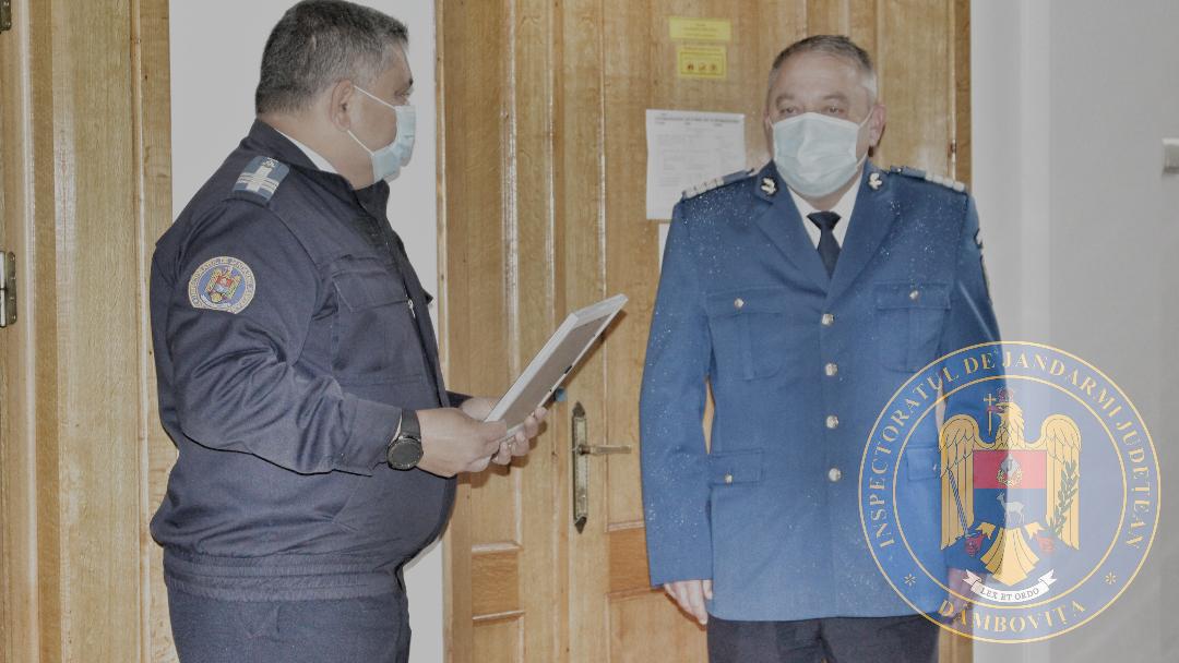 În cadrul activității festive dedicate colegului nostru și desfășurate cu respectarea regulilor privind distanțarea socială, colonel Matei Viorel, Inspector șef al Inspectoratului de Jandarmi Județean Dâmbovița i-a acordat diplomă la încheierea mandatului de onoare în instituția “Oamenilor de arme”, pentru devotamentul, profesionalismul, constanța și loialitatea manifestate de-a lungul carierei.