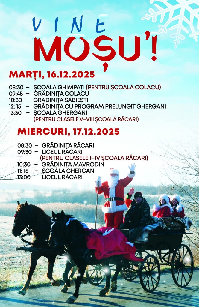 În perioada 16–17 decembrie 2025, Moș Crăciun pornește în tradiționalul său tur prin Răcari, Ghimpați, Ghergani, Mavrodin, Colacu, Săbiești, Bălănești și Stănești, pentru a aduce zâmbete, cadouri și voie bună celor mici.