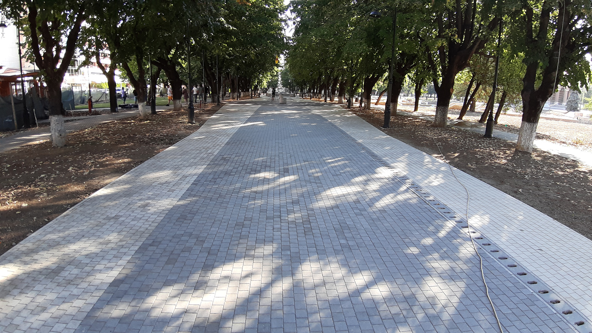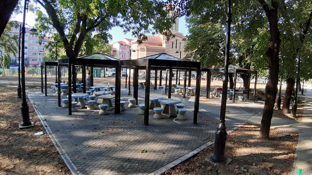 Ca și stadiu al lucrărilor, la acest moment, pavajul nou, diferenţiat, în funcţie de specificul suprafeţei este finalizat, locul de joacă pentru copii este finalizat, terenul de sport, finalizat, fântânile arteziene, finalizate, sistemul de aspersie, finalizat, iluminatul public, realizat în proporție de 90%,mobilierul urban a fost comandat, 150 de bănici urmează să fie aduse și montate.