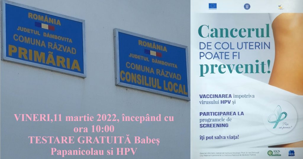 Pe 11 MARTIE , femeile din RĂZVAD pot face teste GRATUITE pentru cancer de col uterin, Primăria Răzvad a ȋncheiat un protocol de colaborare cu Institutul Național pentru Sănătatea Mamei și Copilului Alessandrescu-Rusescu (INSMC), Centrul de Dezvoltare Curriculară și Studii De Gen FILIA, Fundația Renașterea şi Centrul Romilor pentru Politici de Sănătate (SASTIPEN) pentru implementarea unui proiect ȋn cadrul căruia femeile pot beneficia de testare gratuită Babeş Papanicolau şi HPV.