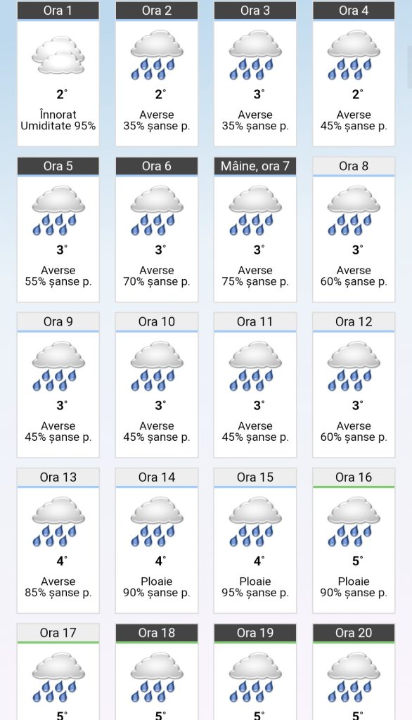 Cer predominant noros, cu averse de ploaie aproape pe tot parcursul zilei Temperaturi scăzute:dimineața: 2–3°C,
