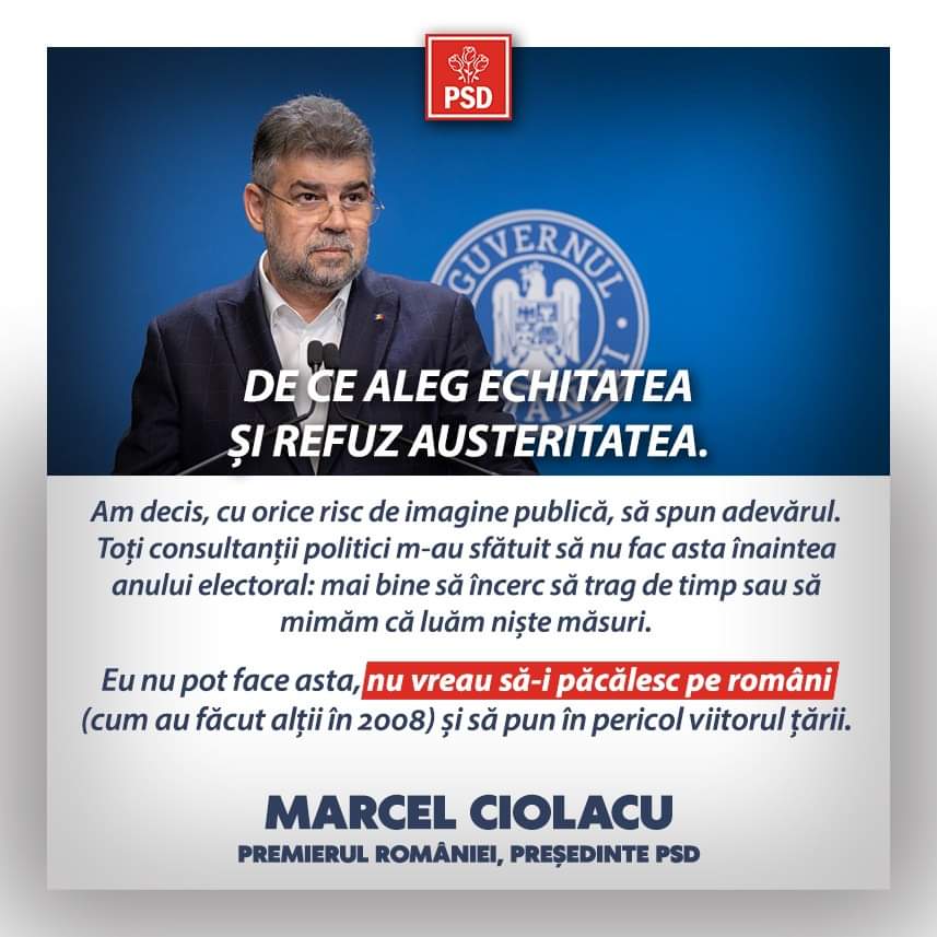 Am decis, cu orice risc de imagine publică, să spun adevărul. Toți consultanții politici m-au sfătuit să nu fac asta înaintea anului electoral: mai bine să încerc să trag de timp sau să mimăm că luăm niște măsuri. Eu nu pot face asta, nu vreau să-i păcălesc pe români (cum au făcut alții în 2008) și să pun în pericol viitorul țării. Iar adevărul crud este că România nu-și mai permite facilități și privilegii de 75 de miliarde de lei, plus o evaziune fiscală de 150 de miliarde de lei pe an. Adunate înseamnă 15% din PIB, adică o frână sinucigașă trasă în calea dezvoltării unui stat modern. Nu există țară europeană care să poată funcționa în asemenea condiții!”, a afirmat Marcel Ciolacu – premierul României, președinte PSD