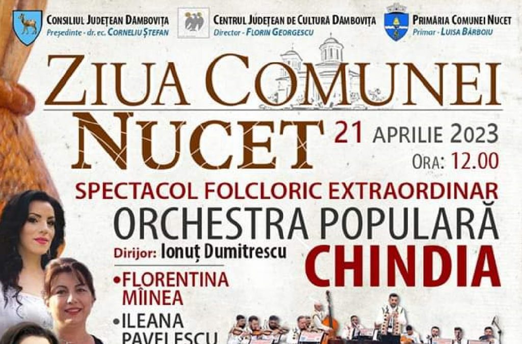 Vineri, 21 aprilie, de Ziua Comunei, la Nucet pe scenă vor urca artiști dâmbovițeni renumiți Ileana Pavelescu, Florentina Mîinea Loredana Dobrescu și Ansamblul Chindia.