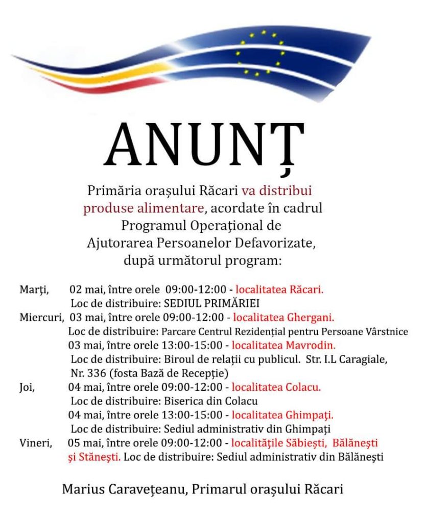 Primăria oraşului Răcari va distribui o nouă serie de produse alimentare de la UE, acordate în cadrul Programul Operaţional de Ajutorarea Persoanelor Defavorizate.