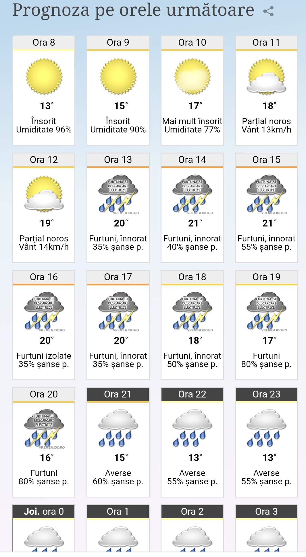 Prognoza meteo indică o zi cu variații semnificative. Dimineața, vremea va fi frumoasă, cu soare și temperaturi ridicate, posibil peste media normală pentru această perioadă. După prânz se așteaptă o creștere a instabilității atmosferice, ceea ce poate duce la averse torențiale, descărcări electrice, vijelii și chiar grindină în unele zone.