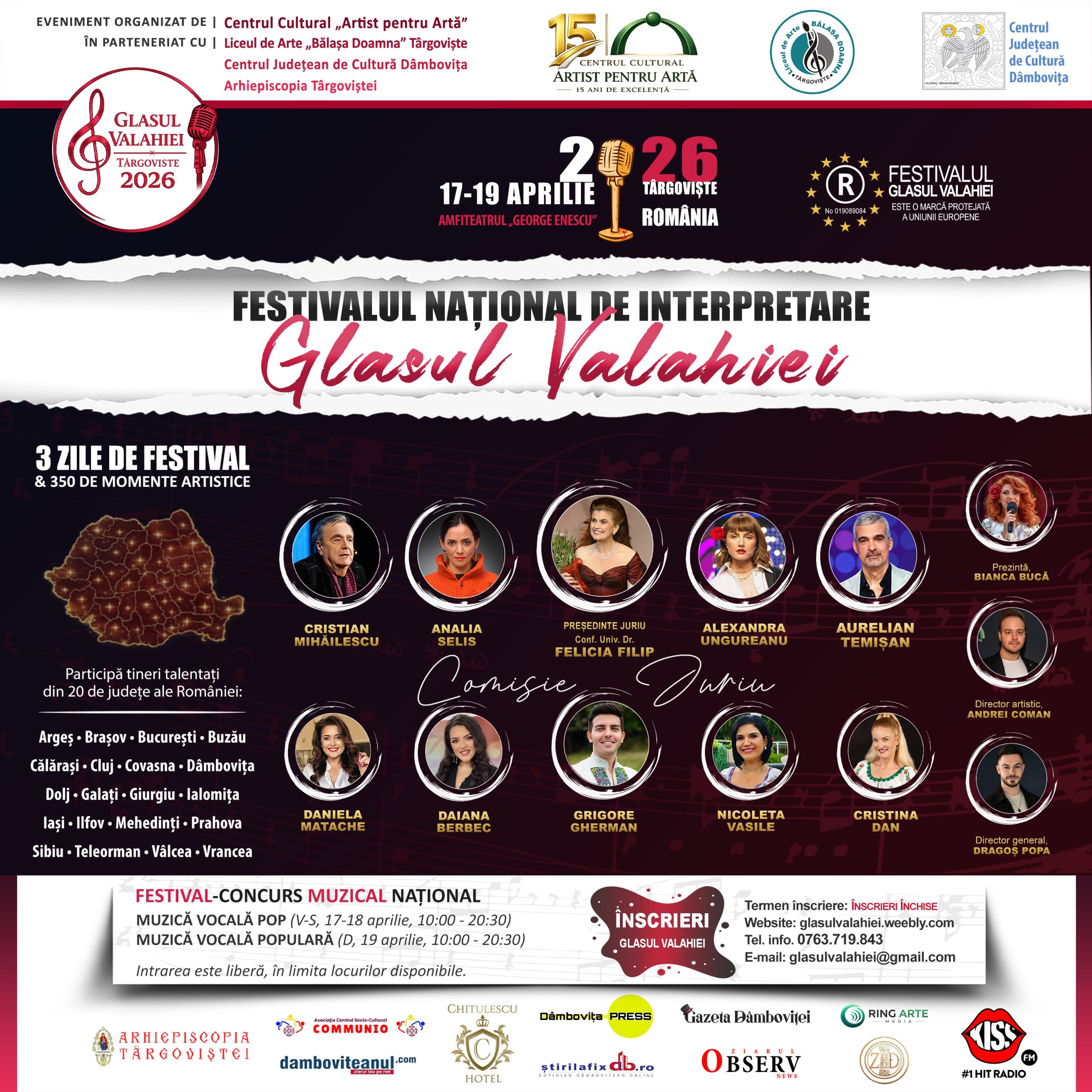 Festivalul Național de Interpretare „Glasul Valahiei” revine anul acesta cu o ediție spectaculoasă, care promite să aducă în prim-plan valoarea artistică a tinerilor interpreți din România. Manifestarea se va desfășura pe parcursul a 3 zile, reunind nu mai puțin de 350 de momente artistice, și va avea loc în perioada 17-19 aprilie 2026, la Liceul de Arte „Bălașa Doamna” din Târgoviște, aducând împreună participanți din întreaga țară.