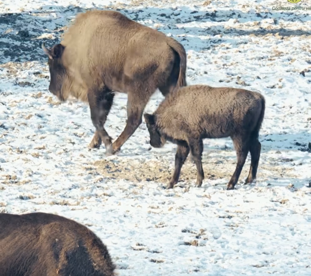 Roșia a fost surprinsă recent în imagini video de Claudia Oros, reprezentant al Regiei Naționale a Pădurilor – Romsilva, iar cadrele oferă o imagine emoționantă a micuței zimbroaice, mereu aproape de mama ei și atent protejată de ceilalți membri ai turmei.