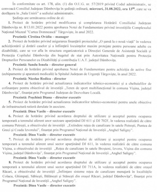 Share WhatsApp Facebook Telegram Twitter Email Se convoacă Consiliul Judeţean Dâmboviţa în şedinţă ordinară, miercuri, 31.08.2022, ora 13.00, care se va desfăşura în „Sala Unirii” a sediului administrativ, cu următoarea ordine de zi: Urmărește Dâmbovița PRESS și pe Google News