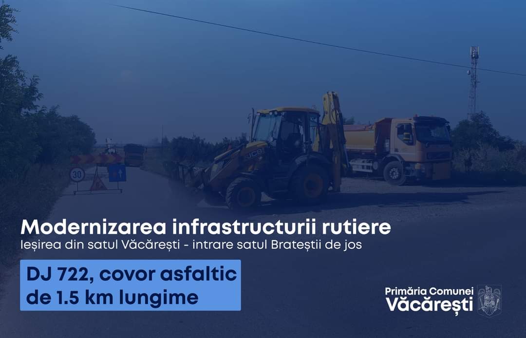 Se lucrează la modernizarea DJ 722, de la ieșirea din satul Văcărești până la intrarea în satul Brăteștii de Jos, o noua investiție ce vizează modernizarea infrastructurii rutiere.