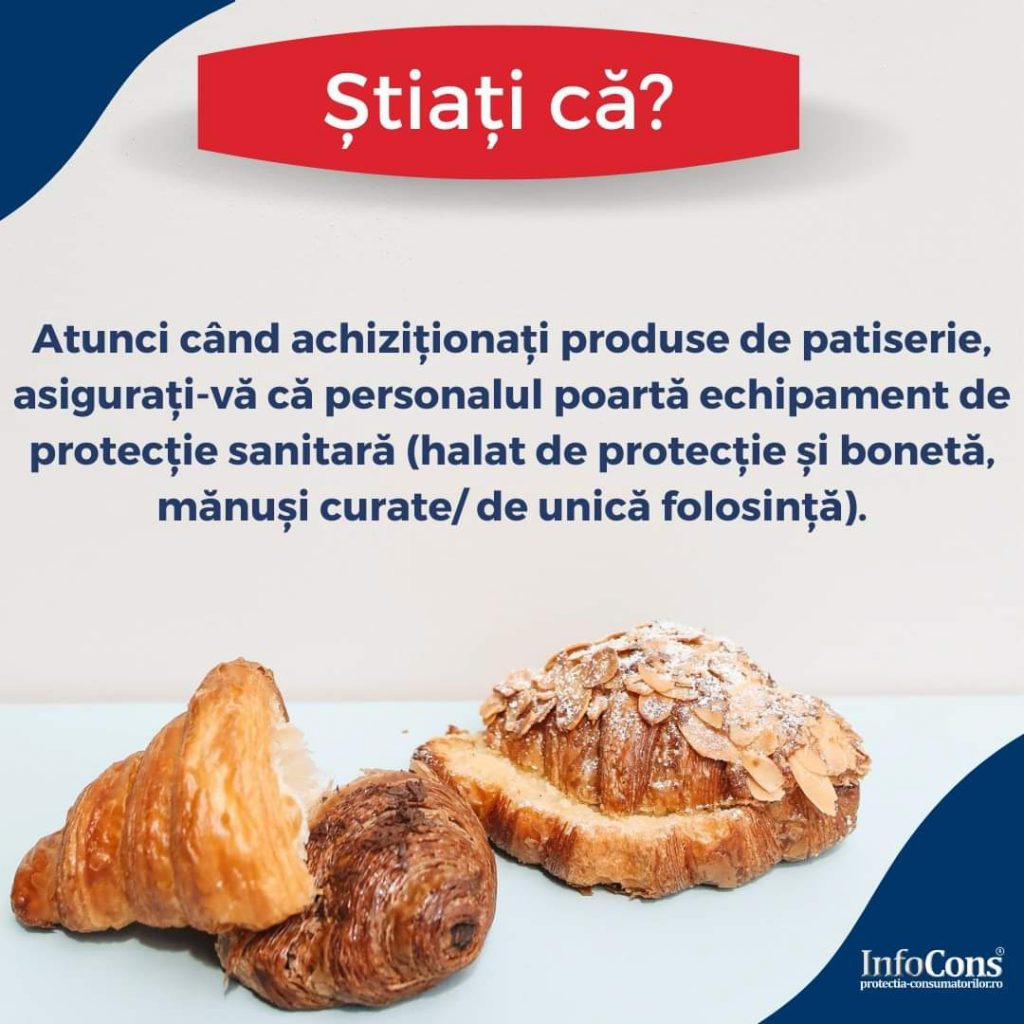 SEMNAL DE ALARMĂ de la ANPC! Atunci când achiziționați produse de patiserie, asigurați-vă că personalul poartă echipament de protecție sanitară (halat de protecție și bonetă, mănuși curate/ de unică folosință).